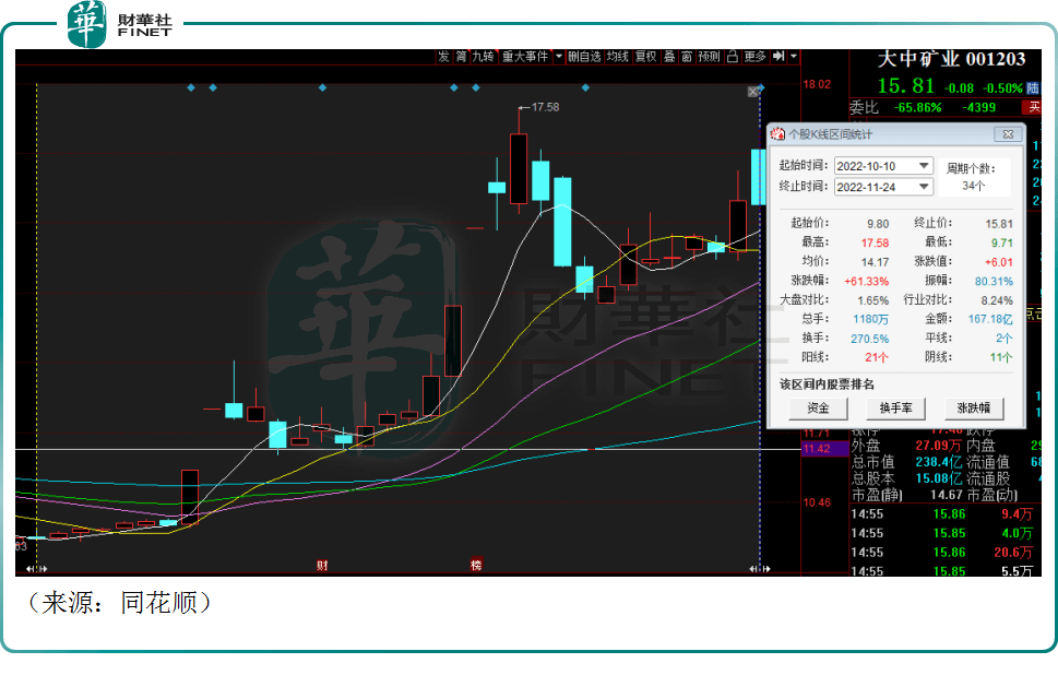 伴隨著大中礦業的涉鋰,其股價節節攀升,截至24日收盤,大中礦業報收15.81元/股,10月初以來的累計漲幅超60%,總市值達238.4億元。