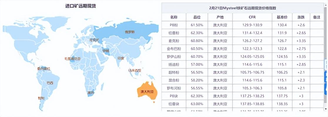 截至2月21日下午收盤,大商所鐵礦石期貨主力合約報收919元/噸,上漲3.43%,創下近九個月來價格新高,較去年10月底上漲超50%。西南期貨數據顯示,目前進口礦報價已逼近130美元/噸,較今年初上漲約10%。