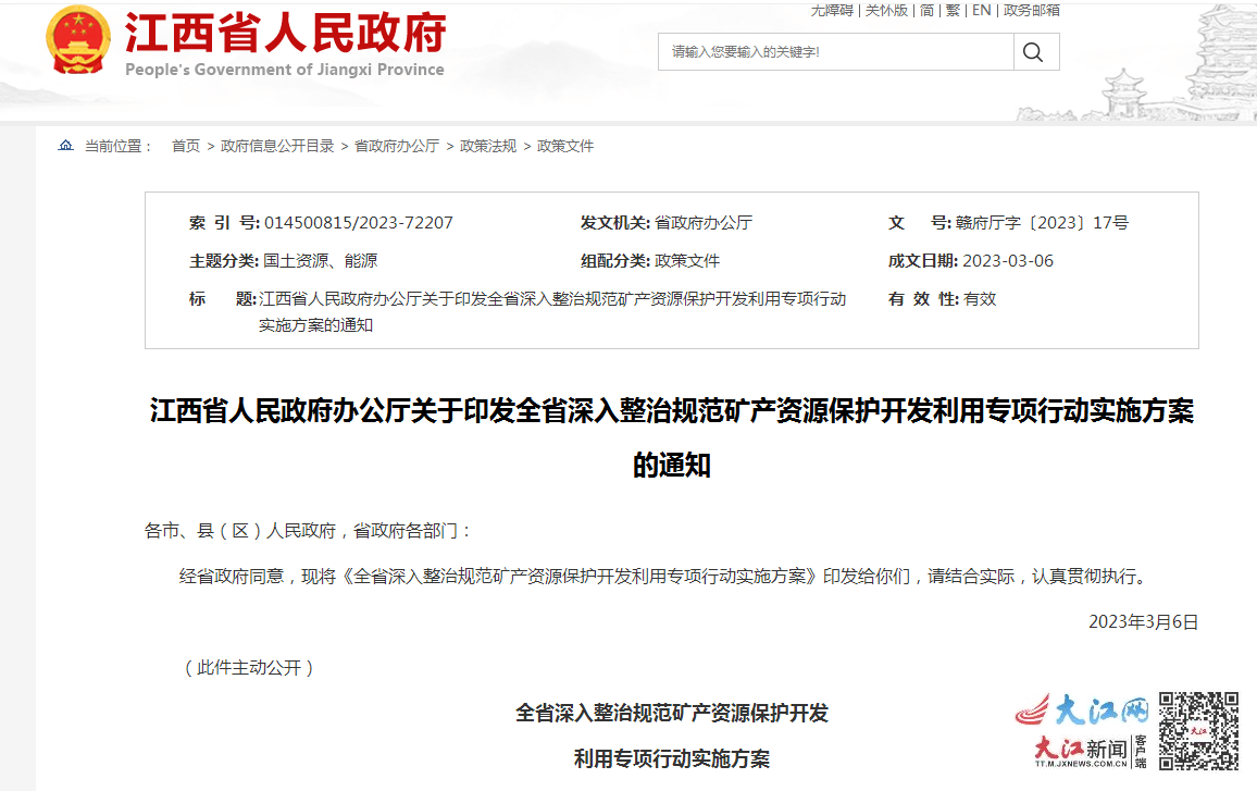 日前,江西省人民政府在其官方網站上發布了《全省深入整治規范礦產資源保護開發利用專項行動實施方案》(下稱《方案》),從礦業權設置審批、礦山開采監管、規范礦山企業經營、礦山生態修復、建設綠色礦山、礦山安全生產和產業鏈供應鏈安全等方面提出了六大措施,深入整治規范礦產資源保護開發利用。