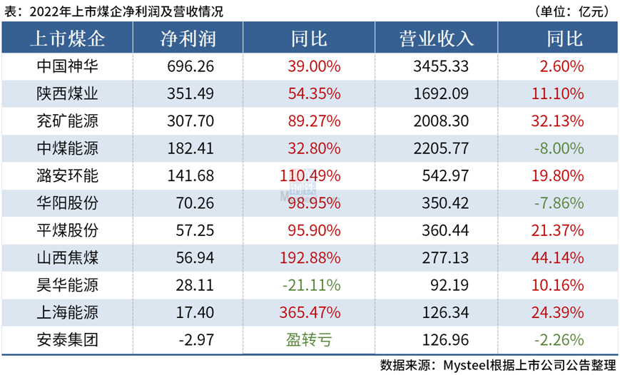 在此之前,陜西煤業2022年實現營業收入1692.09億元,凈利潤351.49億元;我國煤炭龍頭中國神華2022年營收達到3445.33億元,實現凈利潤696.26億元,日賺近2億元。