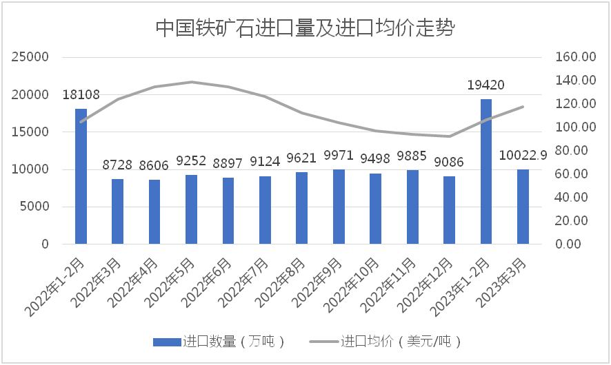 據(jù)海關總署數(shù)據(jù)顯示,2023年1-3月份,我國累計進口鐵礦石29433.5萬噸,同比增長9.8%,進口均價110.6美元/噸,同比下降12.0%。但值得注意的是,今年3月份,我國進口鐵礦石量價齊升,單月進口鐵礦石達到10022.9萬噸,同比增長14.8%,進口均價為117.7美元/噸,較今年1-2月均價上漲11.43美元/噸,增長10.76%。