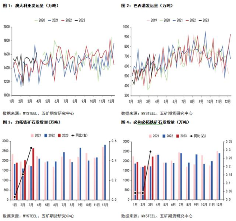 據(jù)mysteel和五礦期貨統(tǒng)計,四大礦山3月份發(fā)貨數(shù)據(jù)同比大幅增加。3月份力拓發(fā)貨量2595.6萬噸,同比增加50%;必和必拓發(fā)貨量2152萬噸,同比增加25%。淡水河谷發(fā)貨量2189.4萬噸,同比增加30%;FMG發(fā)貨量1622.3萬噸,同比增加41%。