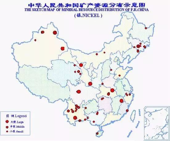 中國鎳礦資源不能滿足需要。總保有儲量鎳784萬噸,居世界第9位。鎳礦產地有近100處,分布于18個省(區(qū))。