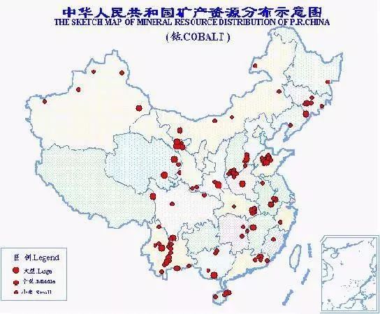 中國鈷礦資源不多,獨立鈷礦床尤少,主要作為伴生礦產與鐵、鎳、銅等其他礦產一道產出。已知鈷礦產地150處,分布于24個省(區(qū)),以甘肅省儲量最多,約占全國總儲量的30%。全國總保有儲量鈷47萬噸。