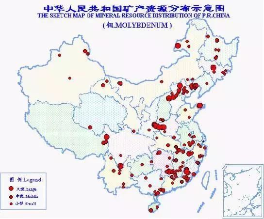 中國鉬礦資源豐富,總保有儲量鉬840萬噸,居世界第2位。探明儲量的礦區(qū)有222處,分布于28個省(區(qū)、市)。以河南省鉬礦資源為最豐富,鉬儲量占全國總儲量的30.1%。
