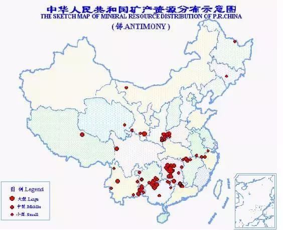 中國是世界上銻礦資源最為豐富的國家。總保有儲量銻278萬噸,居世界第1位。已探明儲量的礦區(qū)有111處,分布于全國18個省(區(qū)),以廣西銻儲量為最多,約占全國的41.3%;其次為湖南、云南、貴州、甘肅、廣東等省。