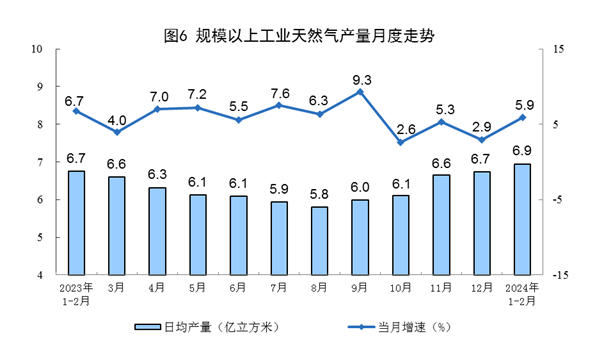 天然氣生產增速加快,進口保持較快增長。1—2月份,規上工業天然氣產量417億立方米,同比增長5.9%。進口天然氣2210萬噸,同比增長23.6%,增速比上年12月份放緩0.1個百分點。
