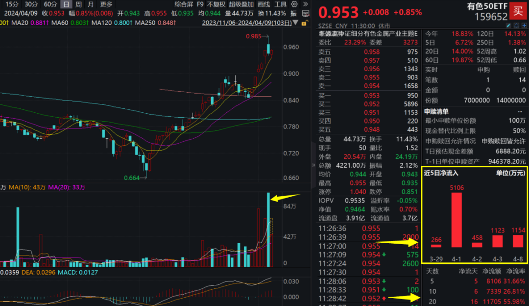 4月8日,有色50ETF(159652)標的指數單日成交額達1億元,刷新自2023年2月上市第二日以來最高單日成交額紀錄!資料顯示,其為全市場銅含量最高的有色指數,其“含銅量”達26.06%。