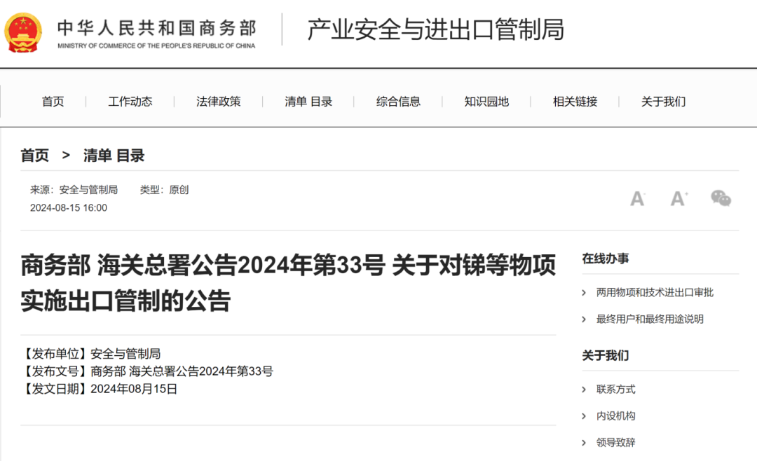 15日下午,商務(wù)部、海關(guān)總署聯(lián)合發(fā)布了《關(guān)于對銻等物項實施出口管制的公告》(下稱“公告”)。公告顯示,根據(jù)相關(guān)規(guī)定,為維護國家安全和利益、履行防擴散等國際義務(wù),經(jīng)國務(wù)院批準,決定對銻等物項實施出口管制。公告自2024年9月15日起正式實施。