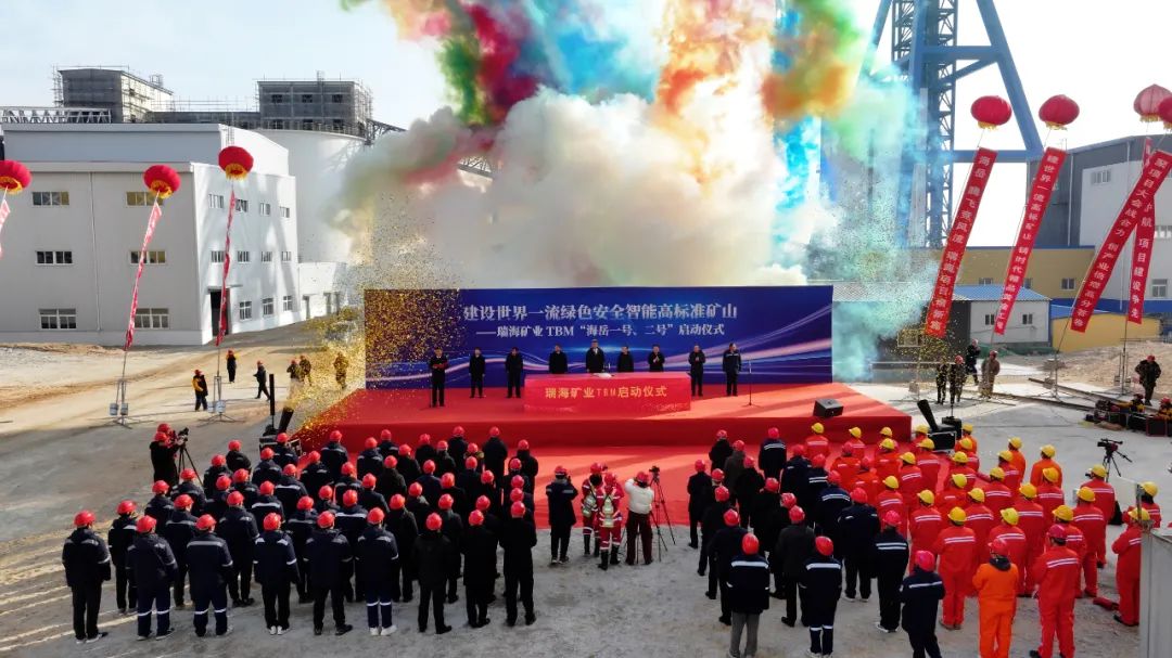 2024年12月30日上午9時36分,瑞海礦業(yè)有限公司副井井塔前嘉賓齊聚、彩球飄飄、旌旗獵獵,十二條巨幅標(biāo)語迎風(fēng)招展,兩臺TBM(全斷面硬巖隧道掘進機)啟動儀式揭幕,瑞海礦業(yè)總經(jīng)理于明海、浙江省隧道工程集團公司副董事長黃德祥、山東招金礦業(yè)股份有限公司董事長姜桂鵬先后作了發(fā)言和致辭。上午10時,隨著萊州市政府副市長邱召明宣布“萊州市瑞海礦業(yè)有限公司‘海岳一號、海岳二號’TBM發(fā)車”,萊州市政府副市長邱召明,招遠市政府副市長荊興業(yè),山東招金集團有限公司副董事長、總經(jīng)理王樂譯,招金礦業(yè)董事長姜桂鵬等嘉賓共同按下啟動球。