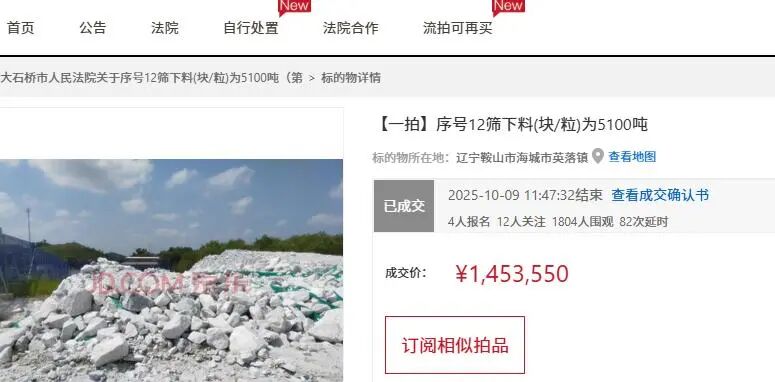 值得注意的是,也是在10月9日,同樣是存放在遼南鎂礦耐火材料廠青山懷鎂礦廠區(qū)內(nèi)的另外一批礦石也是被拍賣,礦石重量為1918噸,不過從圖片來看,礦石質(zhì)量要差一些。
