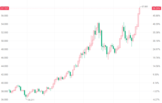 白銀市場(chǎng)表現(xiàn)強(qiáng)勁,Wind數(shù)據(jù)顯示,12月1日,國(guó)際銀價(jià)一度突破57美元/盎司關(guān)口,再創(chuàng)新高;COMEX白銀首次突破58美元/盎司;滬銀主力合約盤中最高漲超7%,達(dá)13520元/千克,創(chuàng)下新高。今年以來(lái),國(guó)際銀價(jià)已上漲超90%,大幅跑贏黃金。