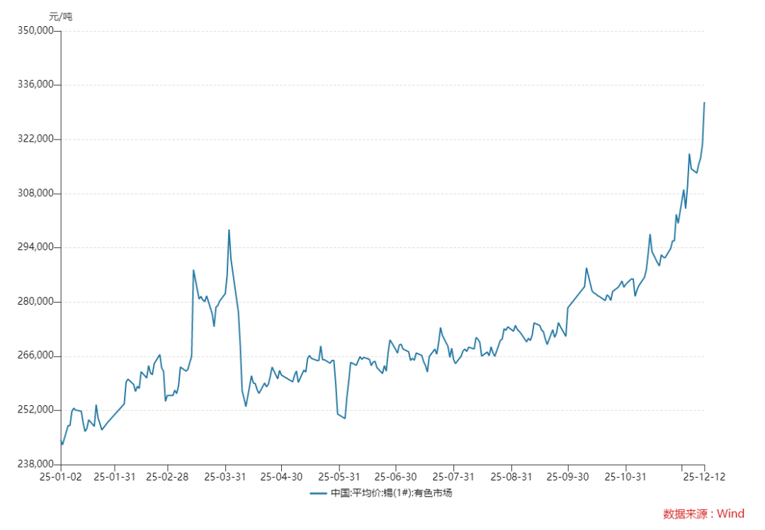 12月12日,國內現貨錫價在突破每噸33萬元整數關口后繼續上行,Wind數據顯示,錫(1#)當日報價達331,640元/噸,單日上漲10,870元,年內累計漲幅約37%,價格攀升至2022年6月以來的最高位。同期,滬錫期貨主力合約亦大幅收高,市場看漲情緒顯著。