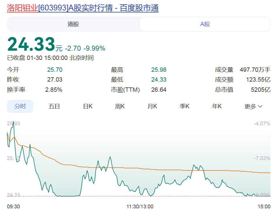 1月30日,A股有色金屬板塊震蕩下行。截止1月30日下午3點(diǎn)收盤,洛陽欒川鉬業(yè)集團(tuán)股份有限公司(以下簡(jiǎn)稱“洛陽鉬業(yè)”)總市值達(dá)到5205.24億元。盡管與上一個(gè)交易日相比,有不小的跌幅,但依然維持在5000億元以上的高點(diǎn)。