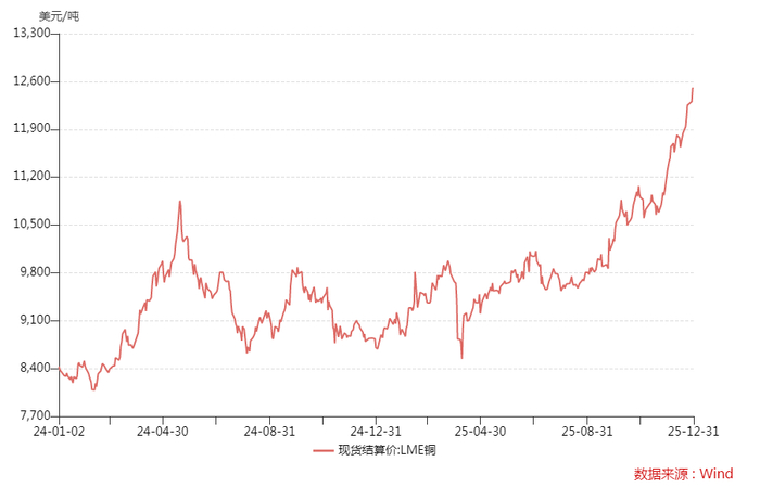 文華財(cái)經(jīng)數(shù)據(jù)顯示,2023年、2024年LME銅年度漲幅分別為2.25%、2.56%,到2025年則大幅提升至42.3%。