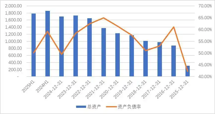 圖:近十年總資產(chǎn)及資產(chǎn)負(fù)債率,單位:億元